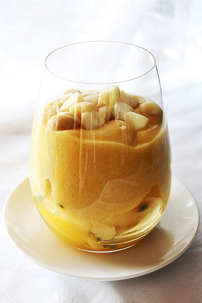 This is a very versatile dessert that you may adapt to whatever fruit you like or whatever is in season. Traditionally, Vispipuuro is made using ligonberries however they a little hard to source in sub-tropical Brisbane. For my first attempt I used a berry juice and matched it with strawberries and blueberries. This time I’ve given it a tropical edge with mango nectar, fresh mango and passionfruit. The tart passionfruit really gave the dessert a lift which without it may have been a bit too bland. The nuts offer flavour, of course, but also a necessary and delightful textural element. You could also serve it with cream or coconut cream if you wish to make it more luxuriant. However I chose to keep mine low-fat as I have been enjoying the holiday season a bit too much! Did you enjoy your holidays too?