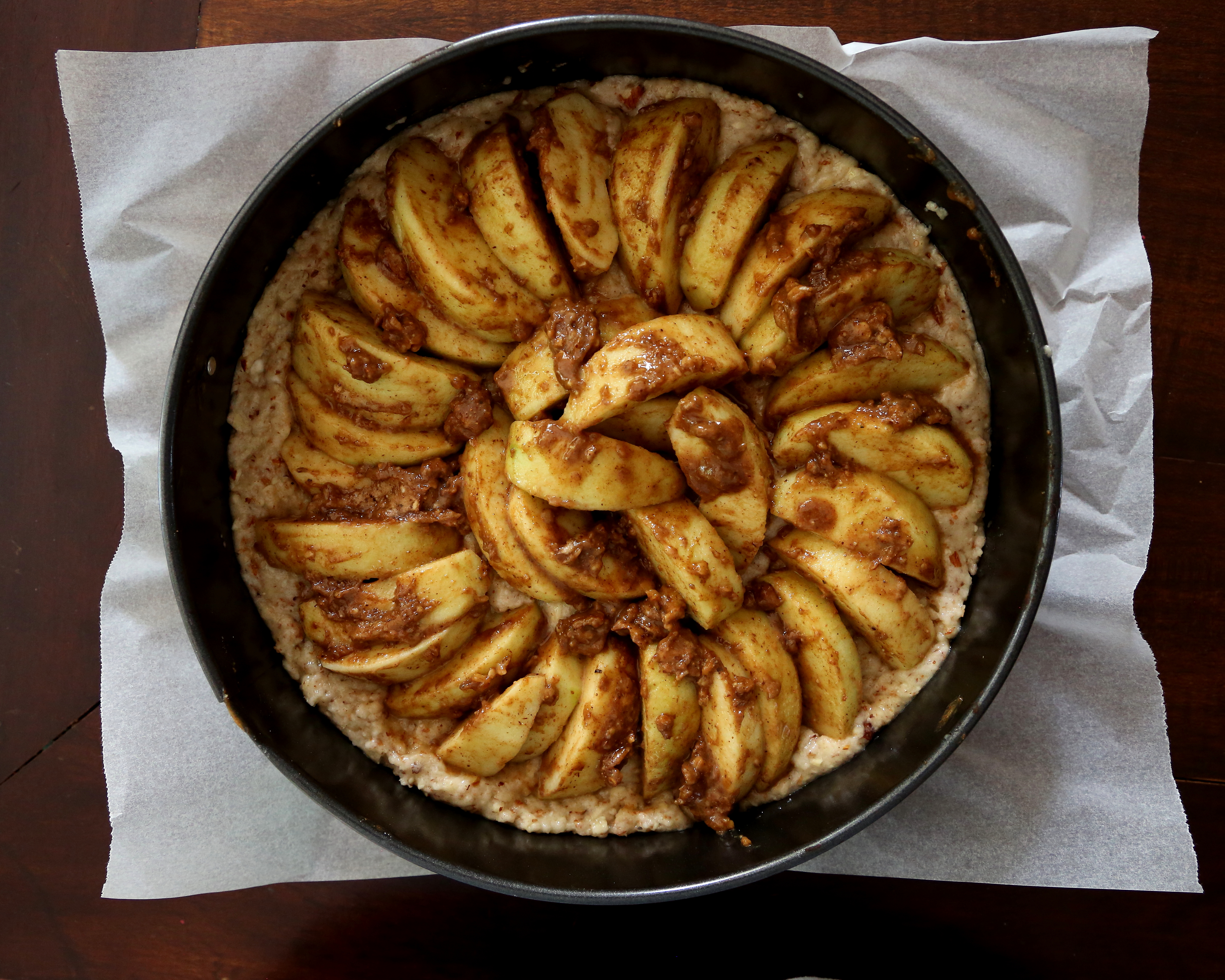 Arrange the apple slices on top of the cake batter. Any leftover almond butter mix may be spread on top.