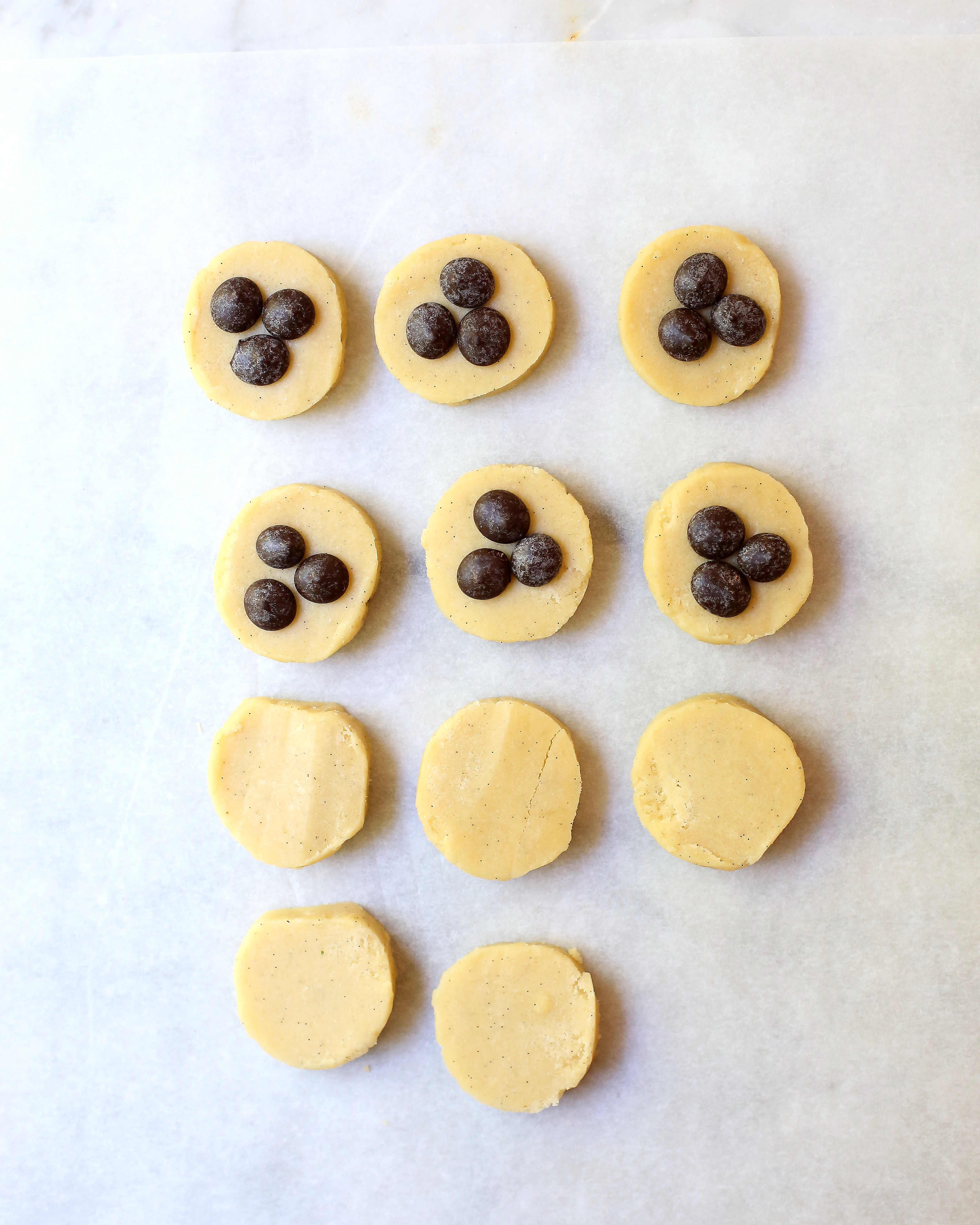 Place it on a lined baking tray. I decorated some with chocolate chips.