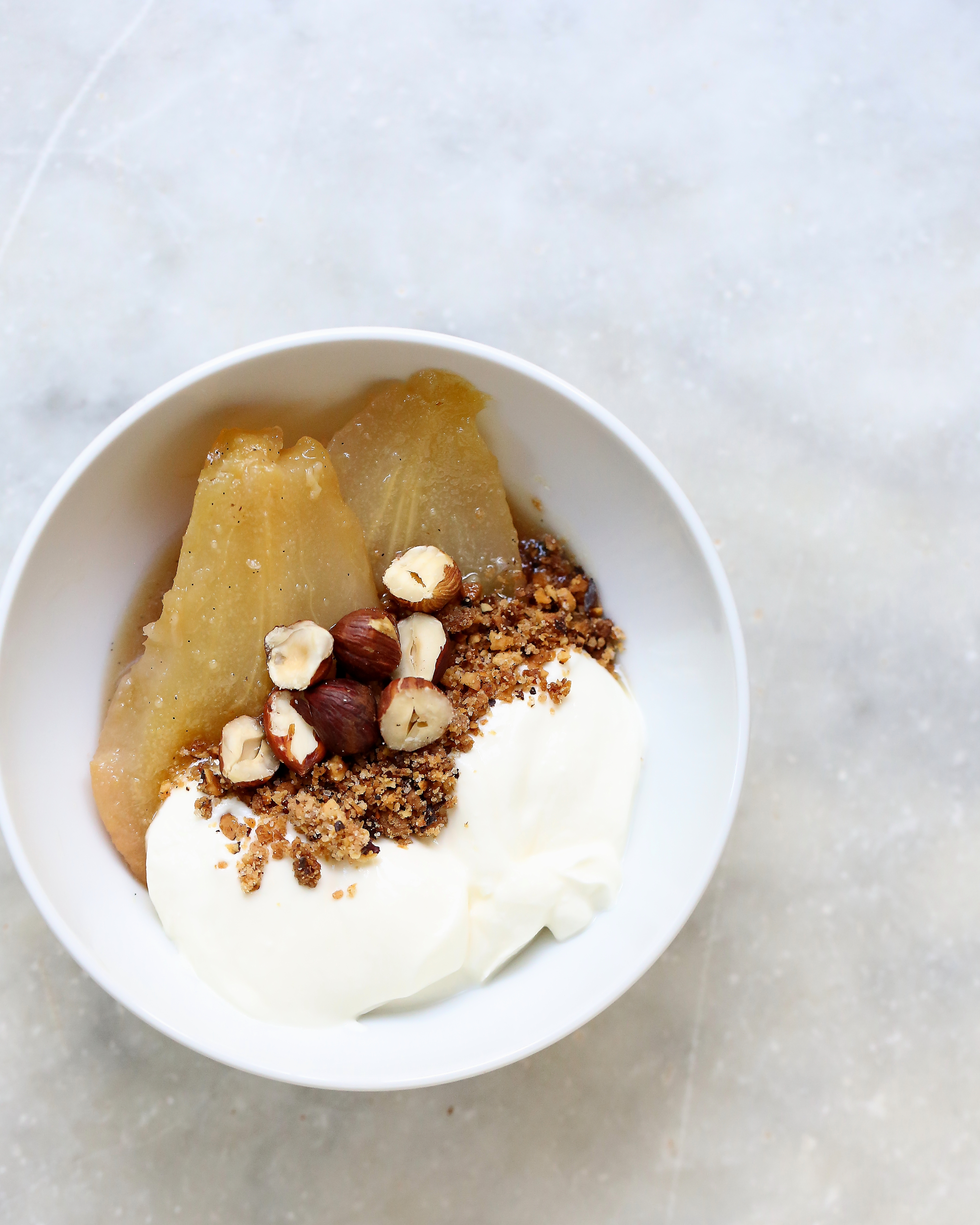Chilled baked pears with yoghurt, crumble and hazelnuts