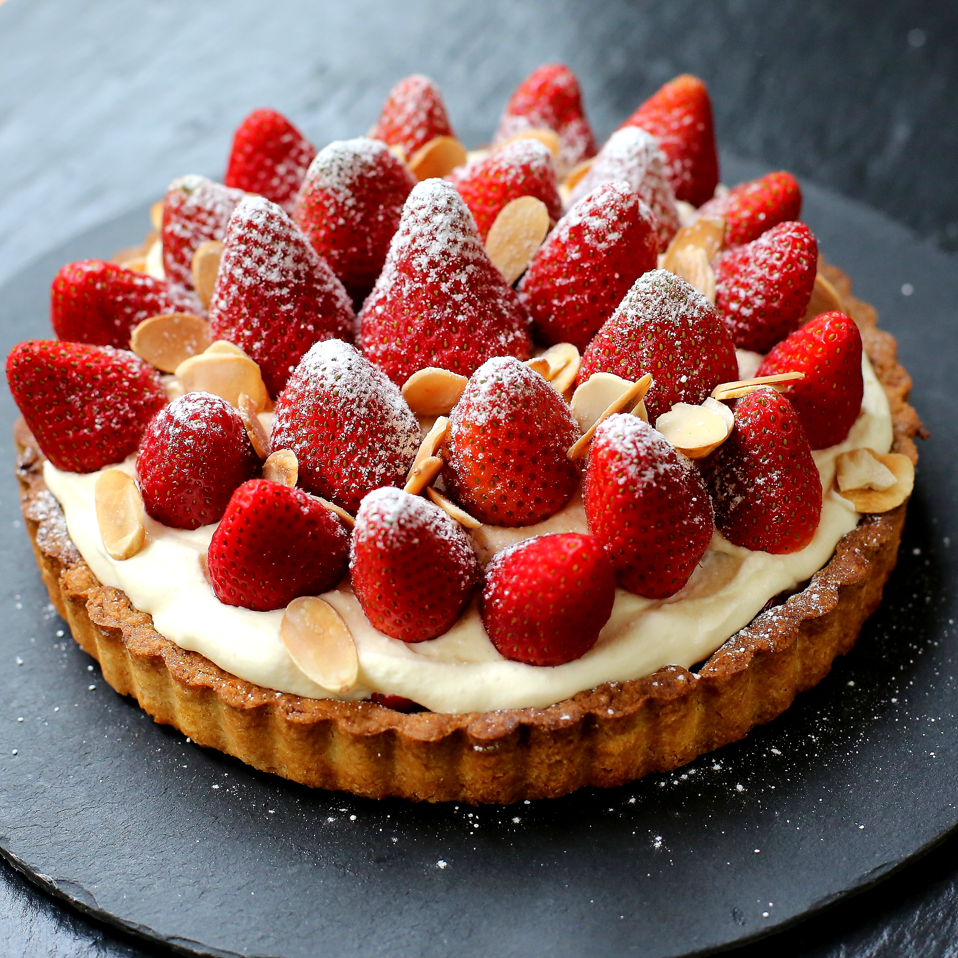 To assemble, place the macerated strawberries in the pastry case, smooth cream over the top, place hulled strawberries on top, sprinkle over icing sugar and scatter toasted almonds over.