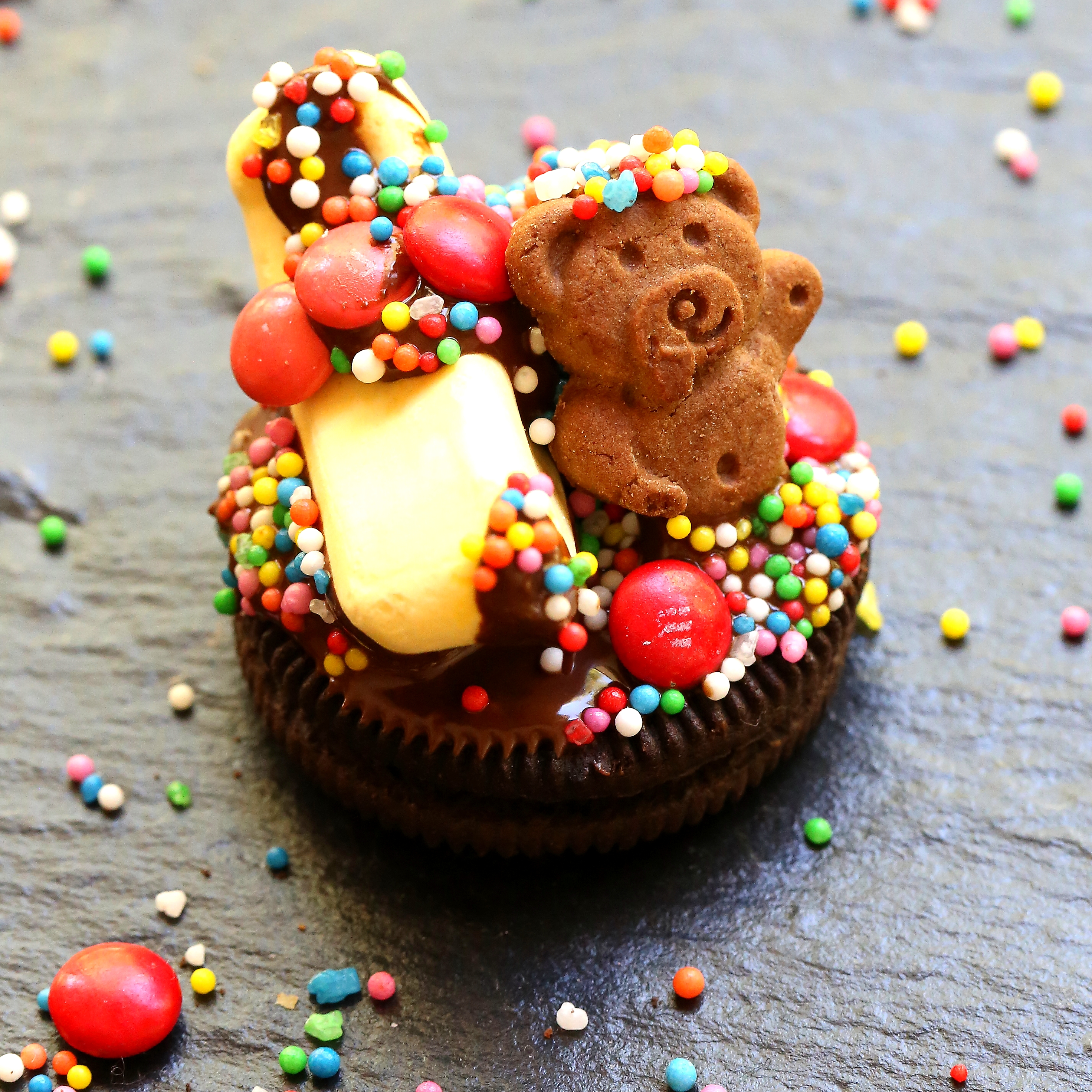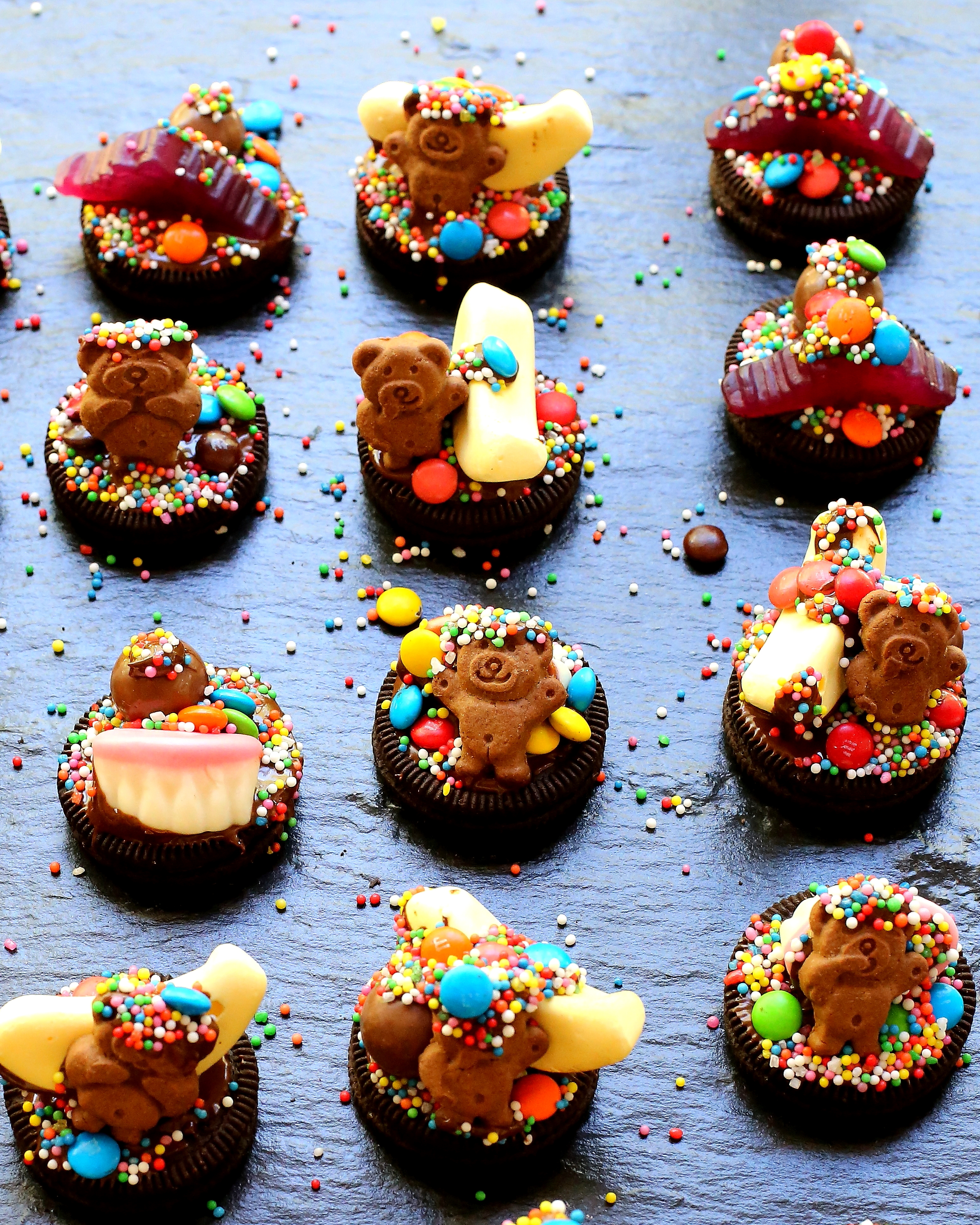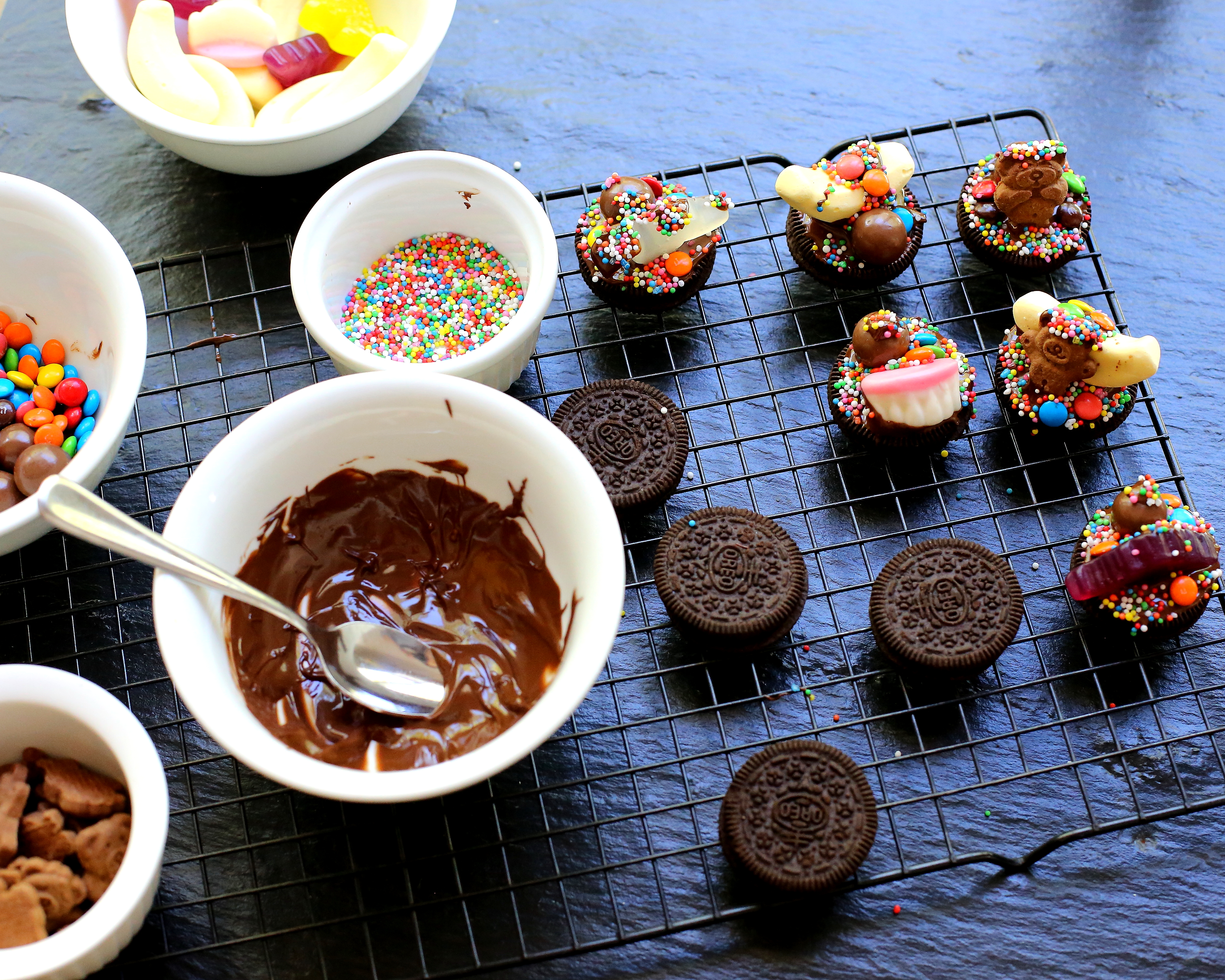 Spoon a small amount of chocolate on one side of an Oreo cookie. Dip the base of some sweets in the chocolate and place on top of the cookie. Drizzle over some extra chocolate. Add mini M&Ms and sprinkles. Repeat. I placed mine in the fridge to set.