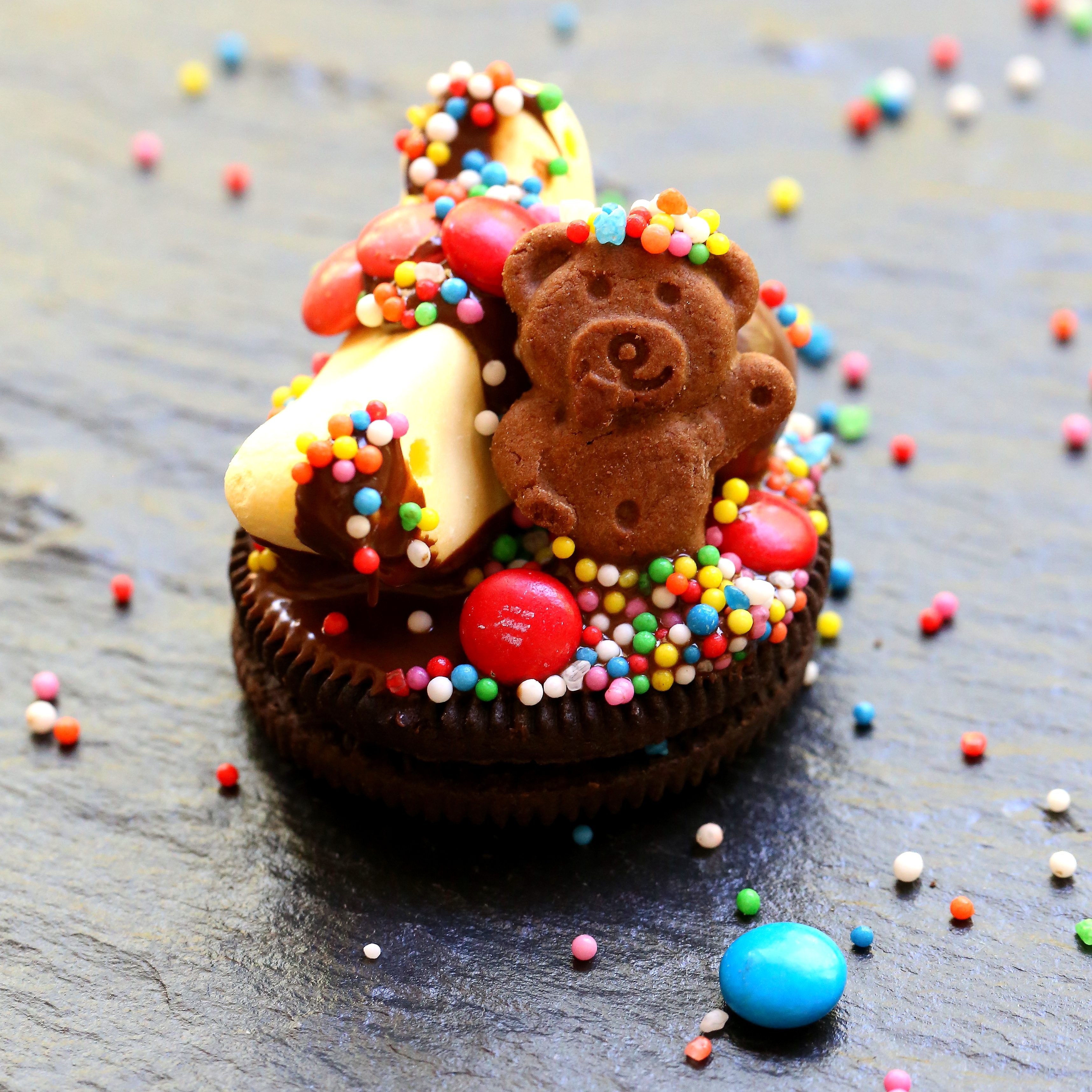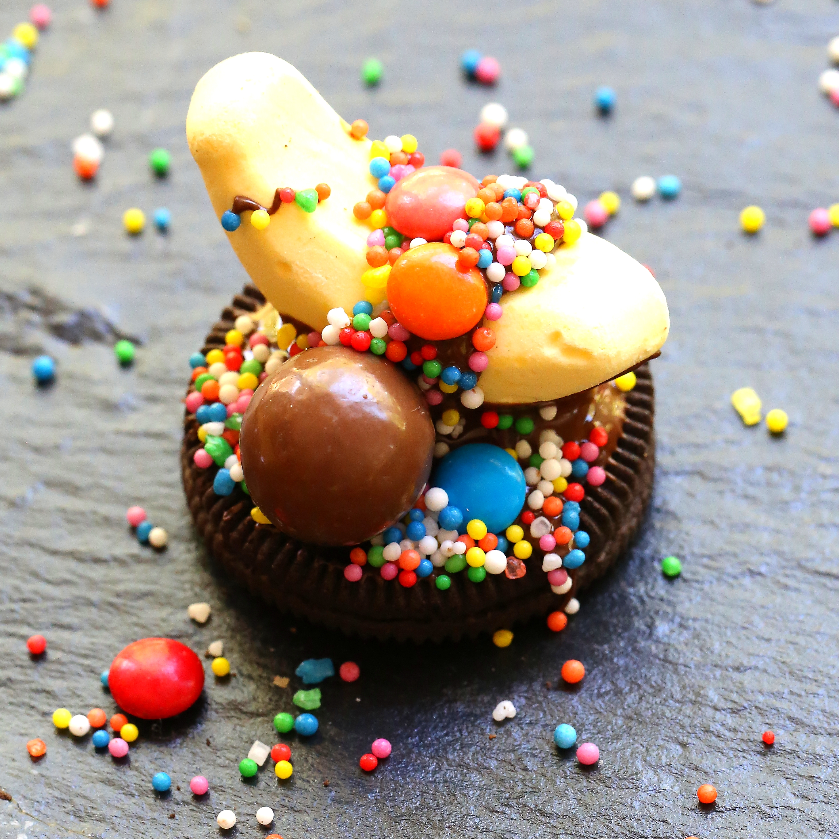 I used Oreo cookies as they are widely available but feel free to use whatever biscuit/cookie you prefer. I would recommend something small though as once the toppings are added it becomes quite a significantly sized treat.