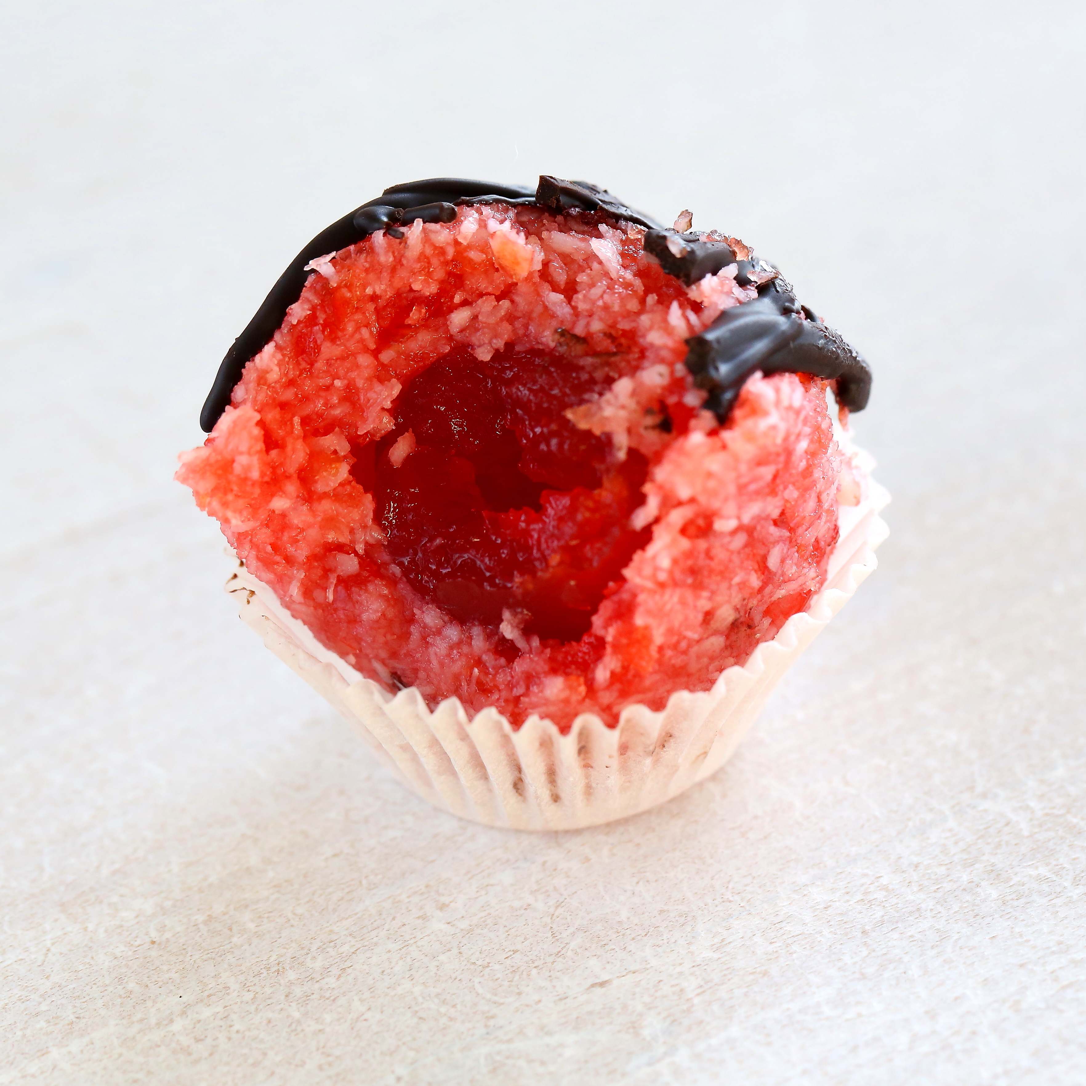 Take heaped teaspoon sized amount of the coconut cherry mix and flatten in your hand. Place a whole glace cherry on top. Mold and roll the coconut cherry mix around the whole cherry. I find it is easier to roll these with slightly damp hands so keep a small bowl of water handy.