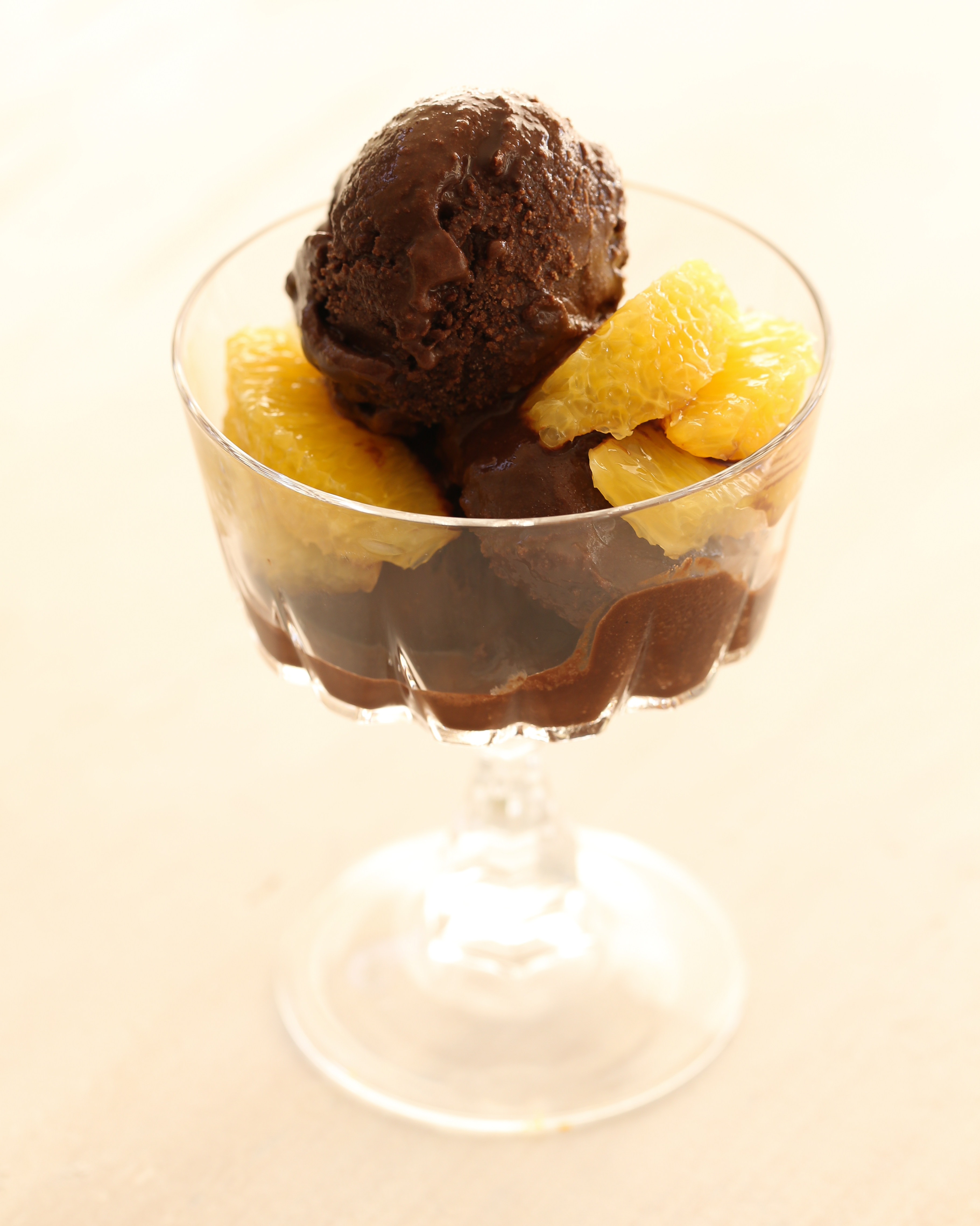 It is imperative that you use only the best quality chocolate and cocoa for this recipe but once you try this you won’t ever want to go back to regular chocolate ice cream or gelato ever again. I used David Lebovitz’s Chocolate Sorbet recipe but replaced the sugar with dark brown sugar and added two tablespoons of Grand Marnier. I served it with orange segments sozzled with more Grand Marnier.