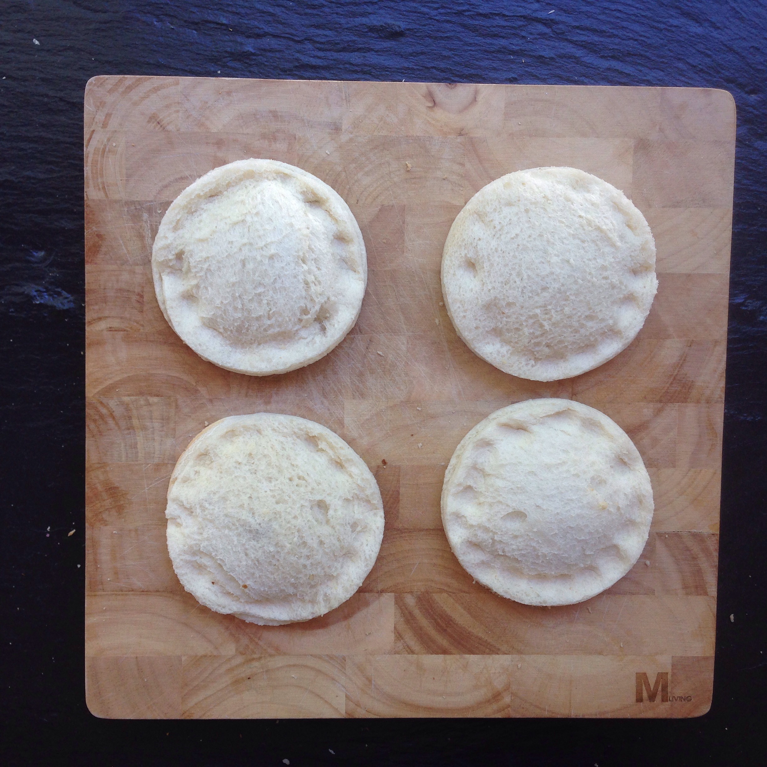 Cut the bread into rounds using a large round cookie cutter (or simply trim the crusts off with a knife if you prefer).