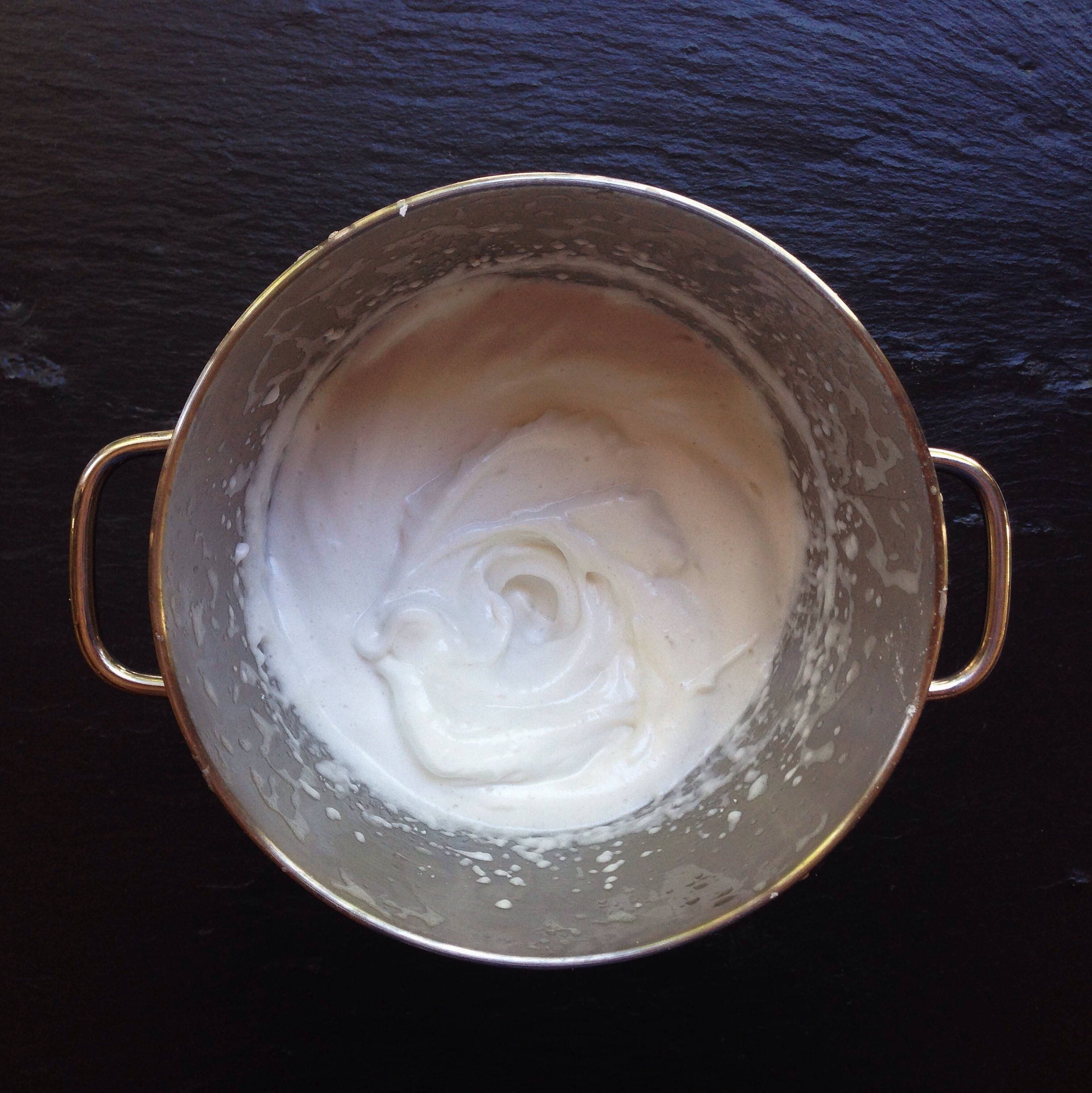 Drain and reserve the liquid from the can of chickpeas. Place the liquid in a large bowl and, using either a standing mixer or handheld electric whisk, whip at high speed. Within a minute or so the liquid will start to foam and then become thick and form stiff peaks. Slowly add the sugar and cream of tartar while continuing to whisk. Whisk until the sugar has completely dissolved.