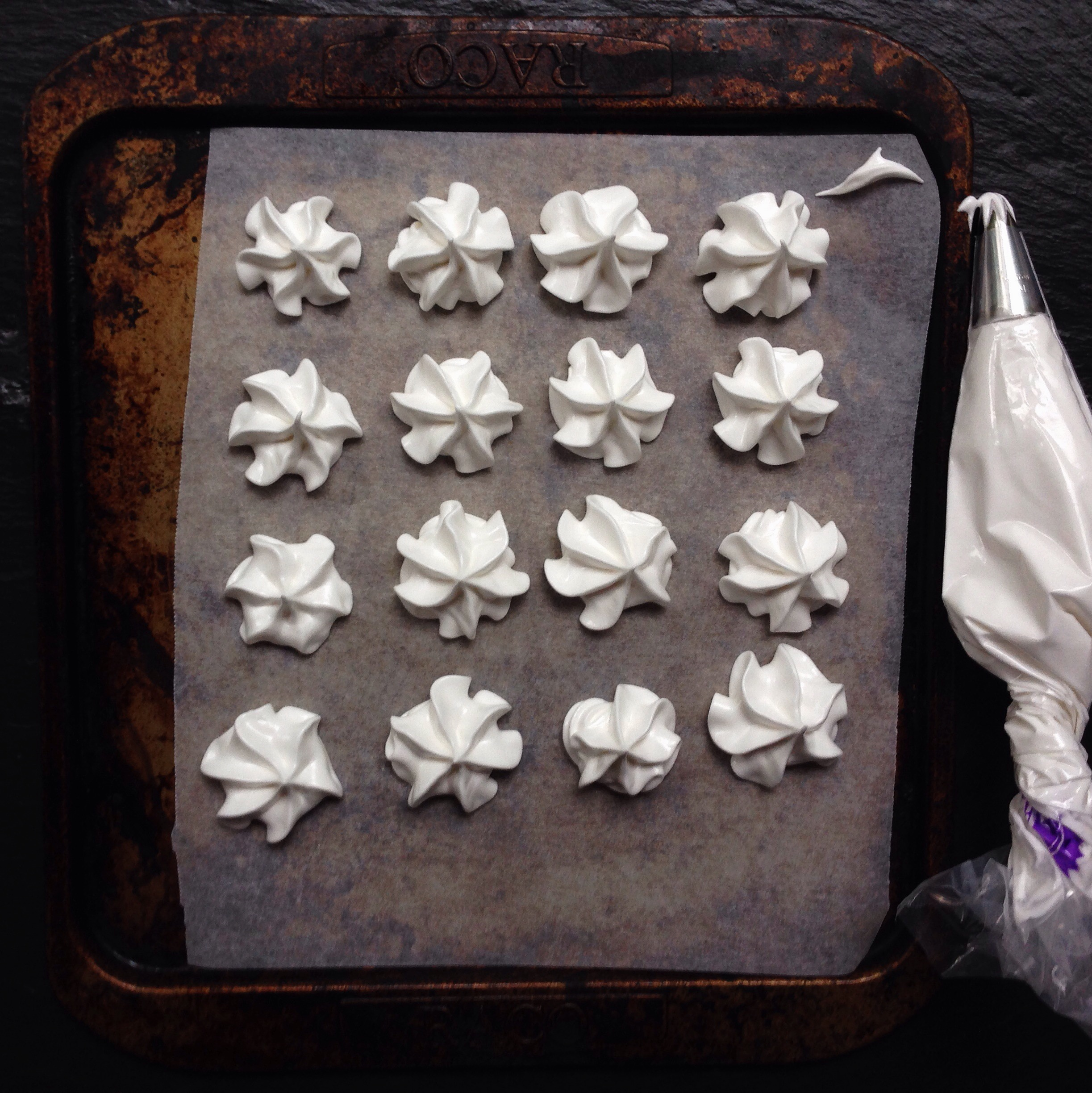 The meringue mixture may then be piped or spooned onto baking trays. Bake for 25 minutes (or longer if your meringue shapes are larger). Switch off the oven and leave the meringues in the oven until cool (about 1.5 hours).