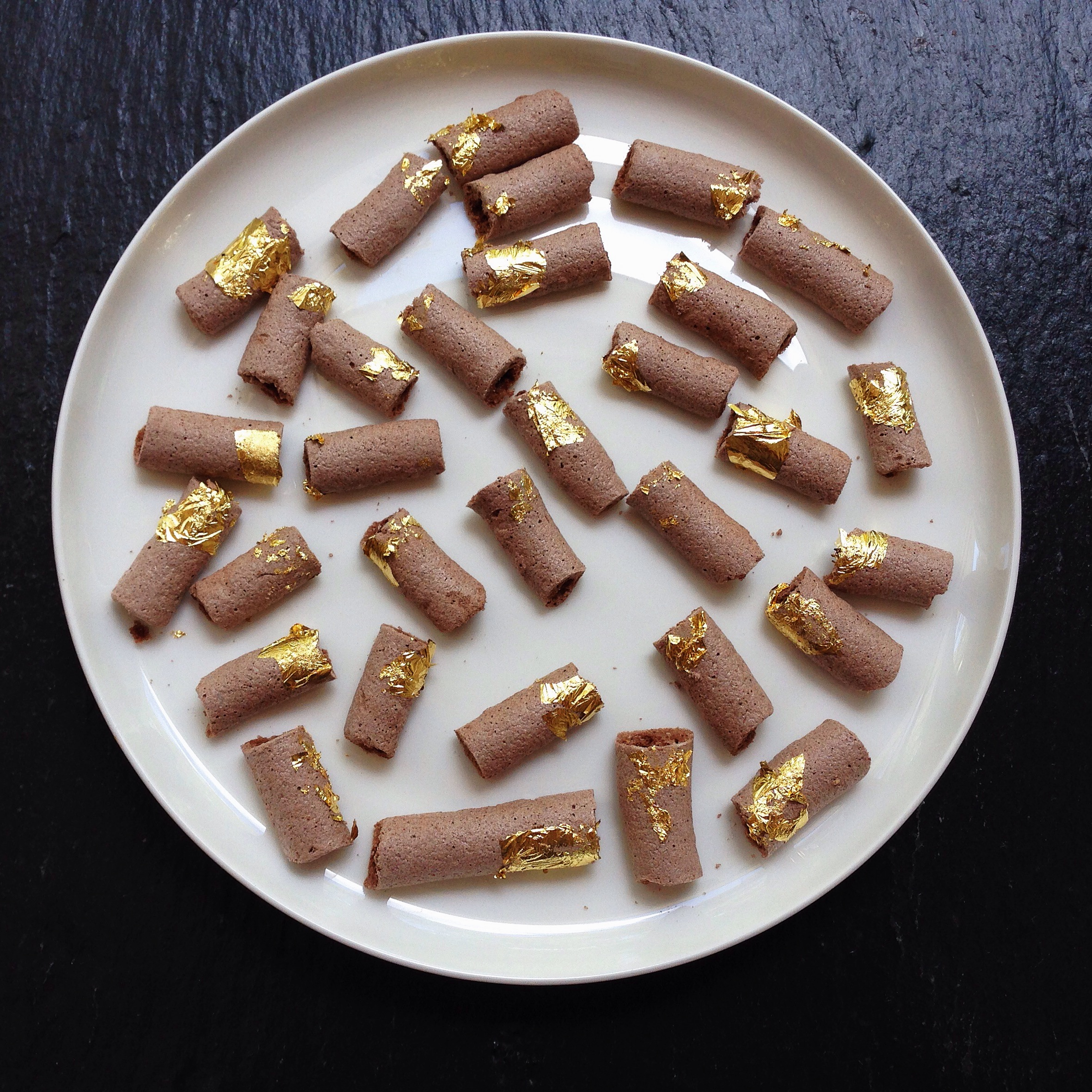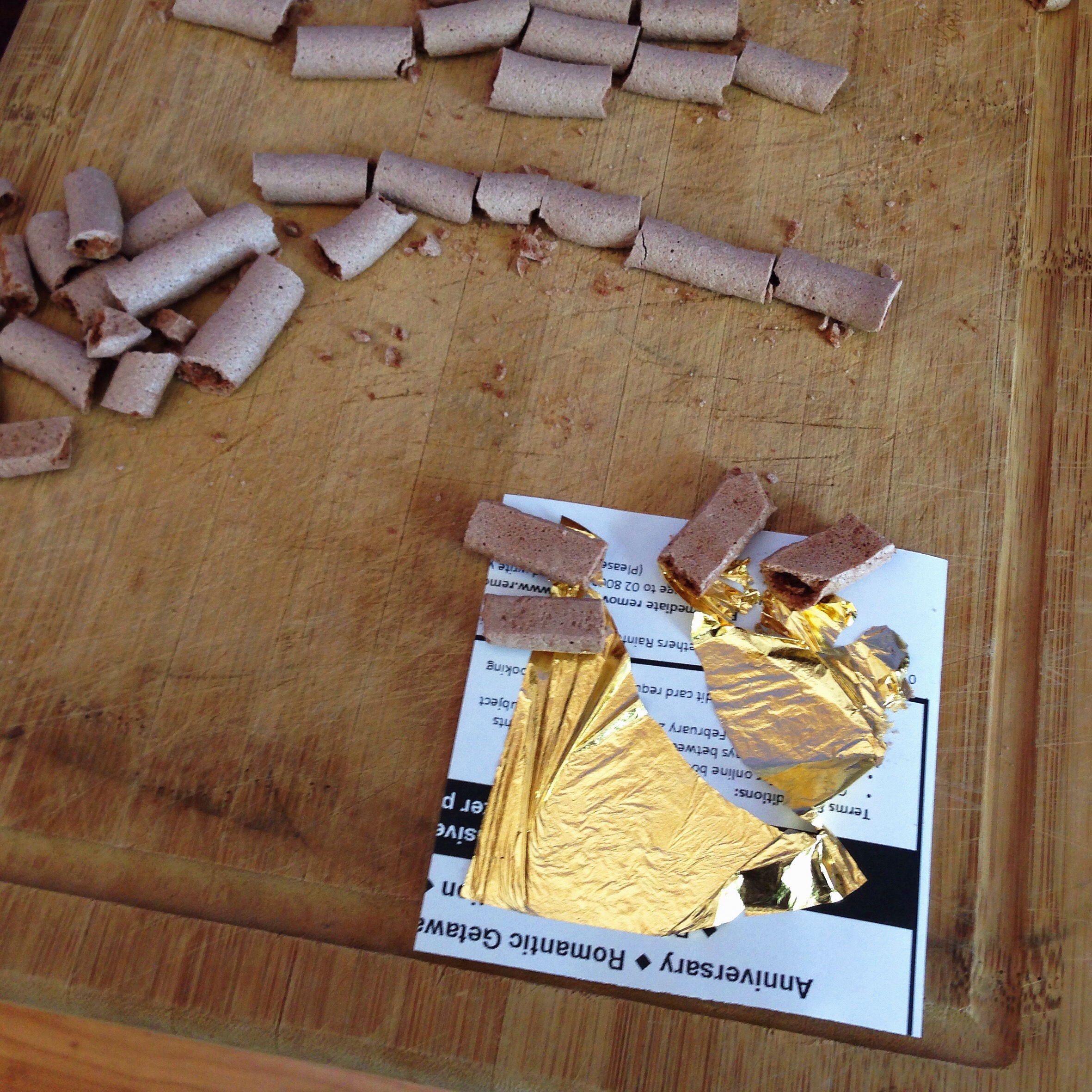 Carefully cut the meringue strips into 3.5cm (1.5 inch) pieces. Select the best looking pieces to decorate with gold leaf. To do this, carefully remove the top paper from the gold leaf. Then gently press a meringue piece onto the edge until the gold sticks to it. If you need to nudge the gold leaf into place use another piece of meringue. Don’t touch the gold leaf with your fingers; it will stick!