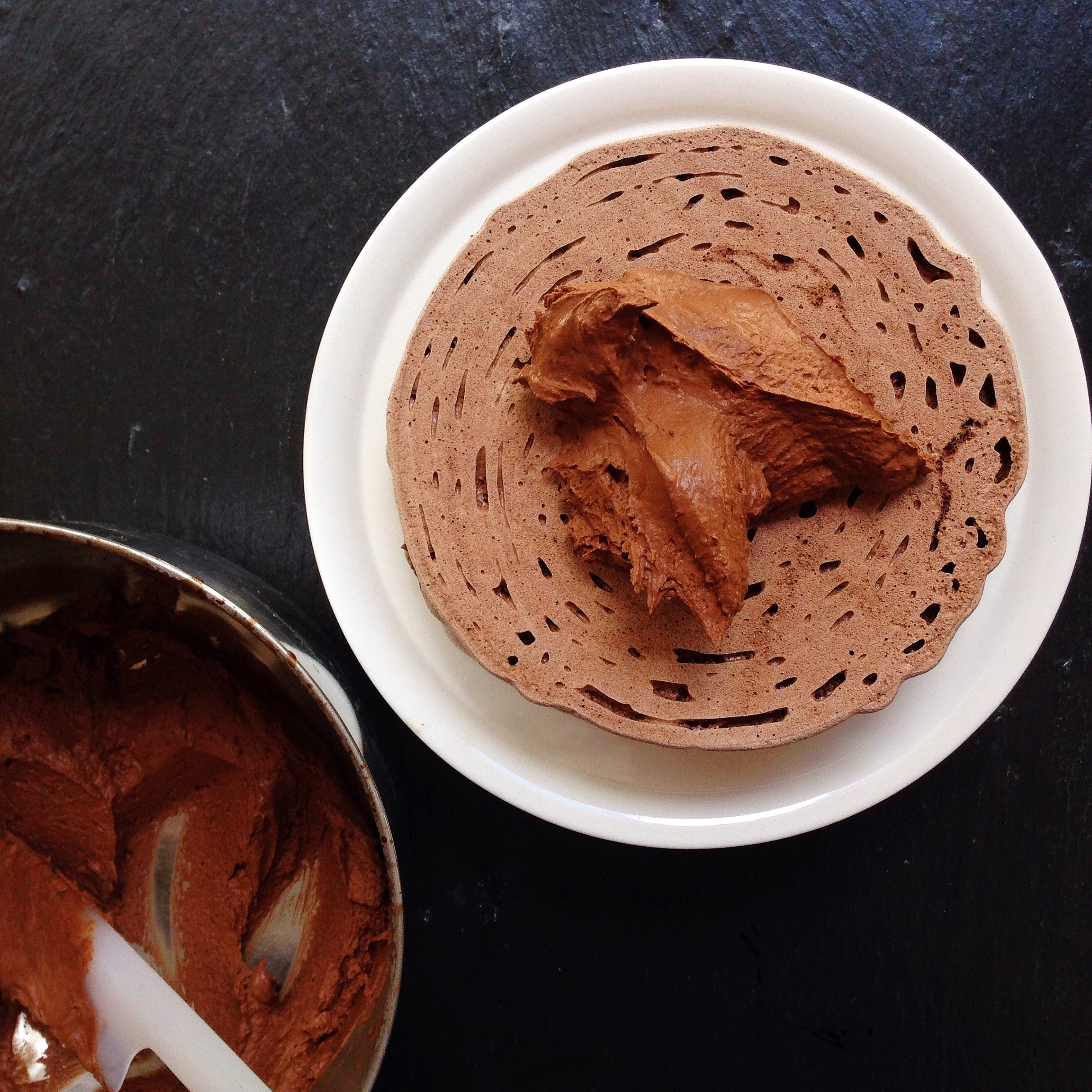 Place one disk of meringue on the cake plate and cover with chocolate mousse; add the second meringue disc and cover with more mousse. Place the third disk – upside down with the flat bottom up – on top. Cover the top and sides with the remaining mousse.