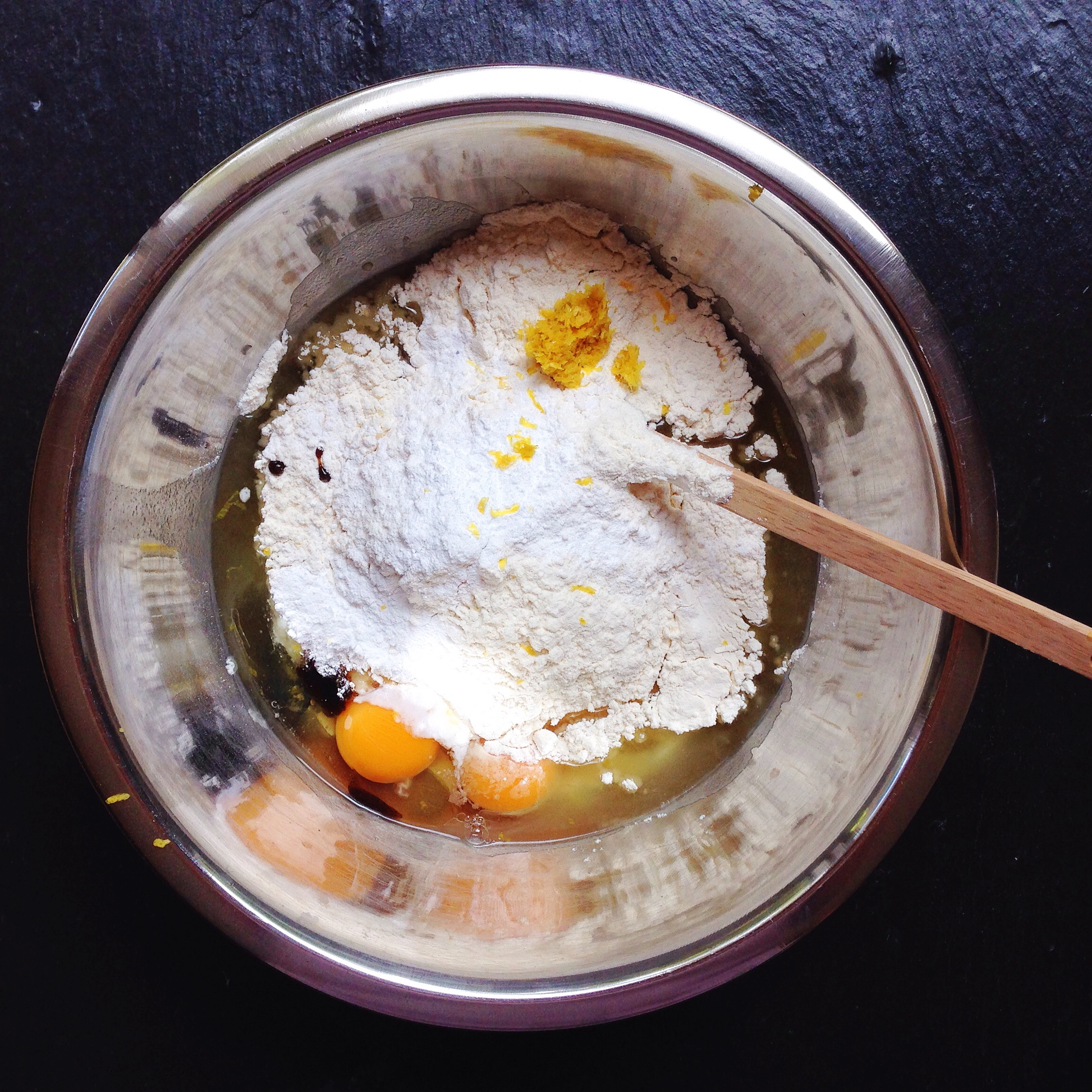 Using the yoghurt container, measure the flour and then the sugar; adding to the bowl. Add the lemon zest, eggs and vanilla. Stir until just combined.