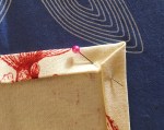 Now the corners! Gently unfold at the corners. Trim off half the fabric, at 45 degree angle, between the inside fold and the tip. Fold this in and iron. Fold the edges back in and over. Pin and iron. This part is a little fiddly; just do your best and try to not burn your fingers on the iron!