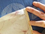 With one piece of fabric (with the right side facing down) fold the edge in 2cms (4/5 inch) all the way along; pin; iron. Repeat on all sides. Don’t worry too much about the corners at this stage; that will be revisited later.